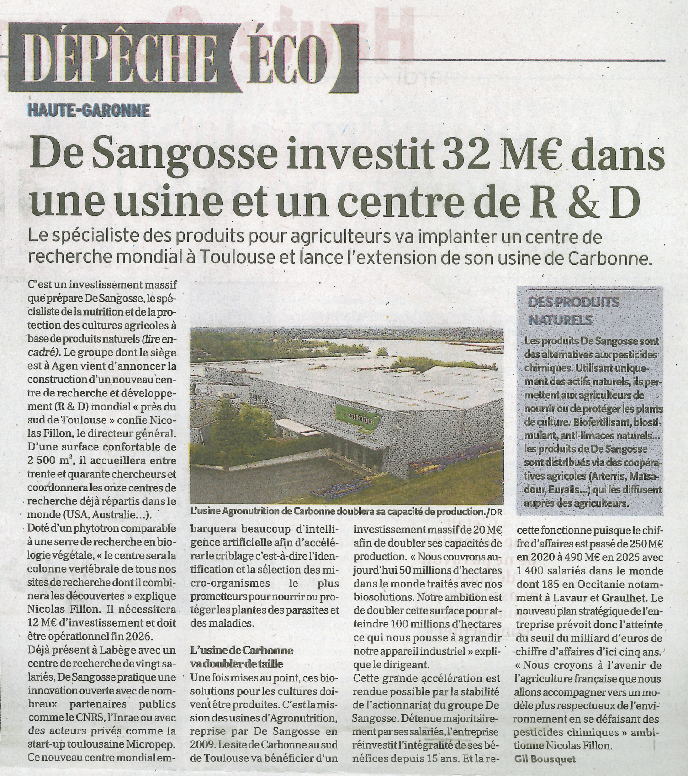 C’est un investissement massif que prépare De Sangosse, le spécialiste de la nutrition et de la protection des cultures agricoles à base de produits naturels.